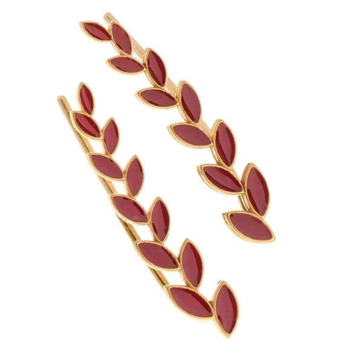 Ζευγάρι αναρριχώμενα σκουλαρίκια κλαδί με φύλλα με κόκκινο σμάλτο, από ασήμι 925° με κίτρινη επιμετάλλωση και επιπλέον ρητίνη για αντοχή στο χρώμα.