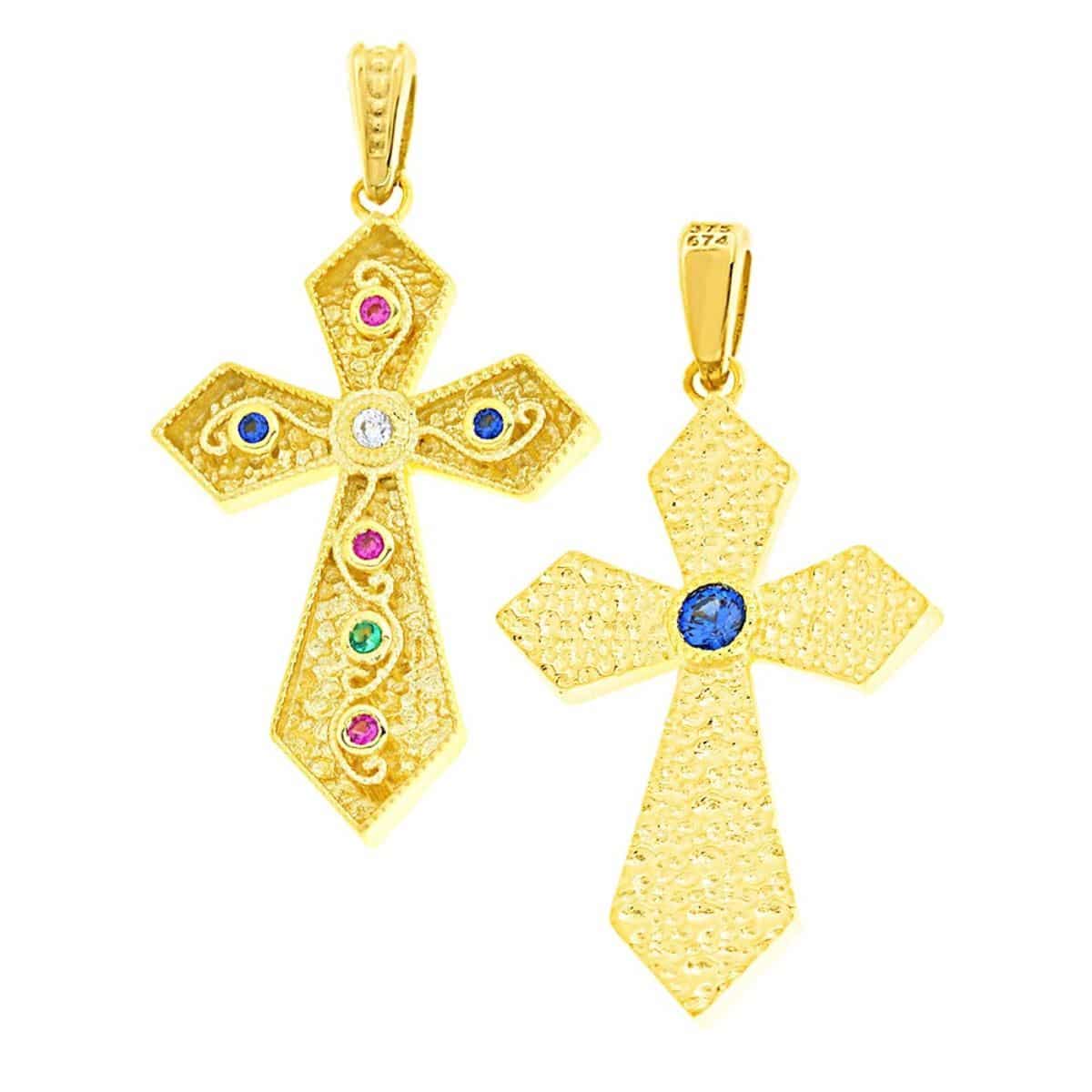 Βυζαντινής τεχνοτροπίας σταυρός διπλής όψης για βάπτιση κοριτσιού ή για γυναίκα. Στη μία πλευρά διαθέτει υπερυψωμένο σχέδιο με καράβολες και καστονάκια με λευκή, πράσινες, ροζ και μπλε ζιργκόν πέτρες, που αναδεικνύεται μέσα από το σφυρήλατο σκαμμένο φόντο. Στην άλλη πλευρά έχει μία μεγαλύτερη μπλε ζιργκόν πέτρα στο κέντρο και σφυρήλατη επιφάνεια. Είναι σετ μαζί με αλυσίδα κατασκευασμένα από κίτρινο χρυσό 14 καρατίων.