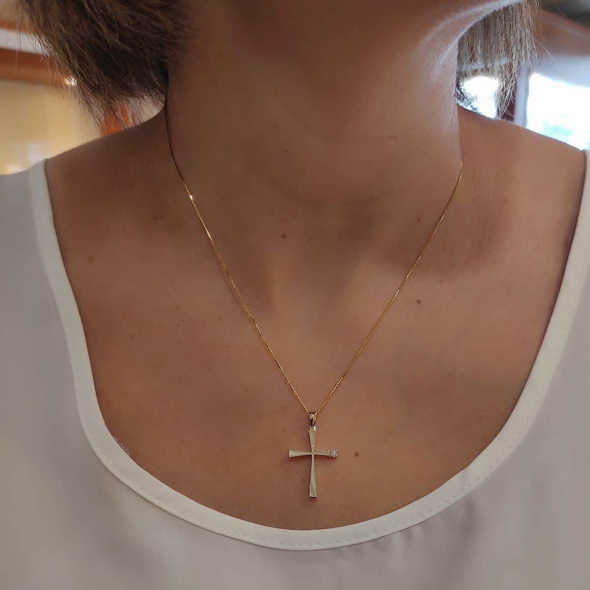 Γυναικείος και βαπτιστικός σταυρός σετ με αλυσίδα, από λείο κίτρινο χρυσό 14 καρατίων. Ο σταυρός στενεύει στο κέντρο και είναι στολισμένος στη μία πλευρά με ένα λευκό φυσικό διαμάντι κοπής μπριγιάν.