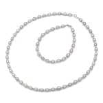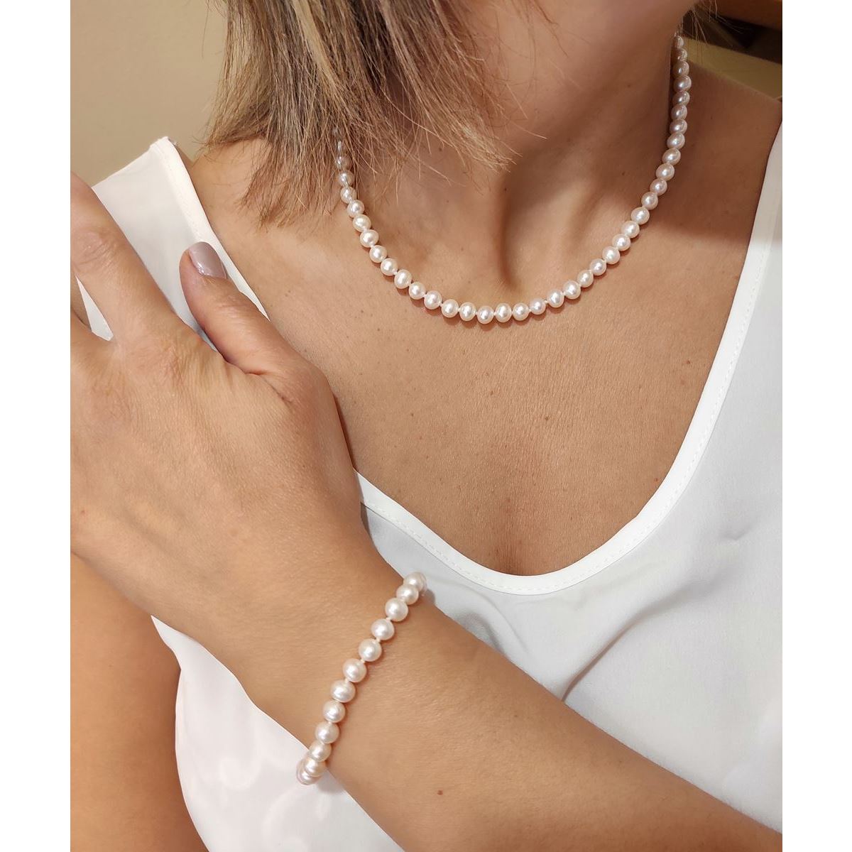 Αναδείξτε τη διαχρονική κομψότητα με αυτό το πολυτελές σετ κολιέ και βραχιόλι με λευκά μαργαριτάρια γλυκού νερού Fresh Water Pearl διαμέτρου 6-6,5mm σε σχήμα Semi Round (Στρογγυλοποιημένο) ποιότητας ΑΑΑ.