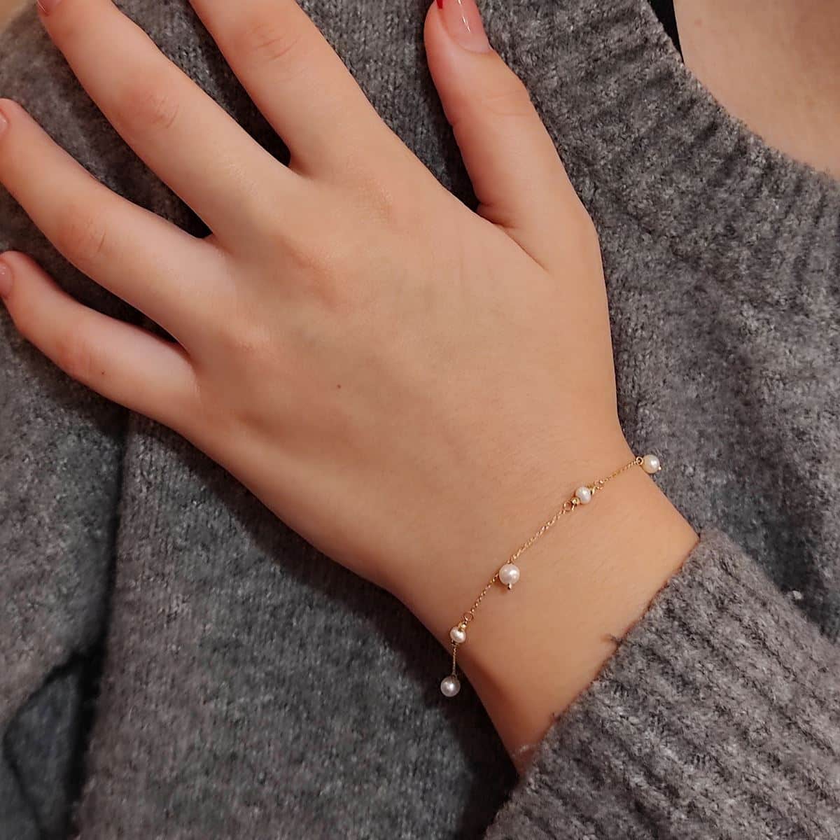 Βραχιόλι αλυσίδα από κίτρινο χρυσό 9 καρατίων με λευκά μαργαριτάρια γλυκού νερού F.W.P. Τα μεγαλύτερα στρογγυλά είναι κρεμασμένα από την αλυσίδα, εναλλάξ με τα μικρότερα που είναι ενσωματωμένα επάνω της και διακοσμημένα διαμανταρισμένες μπίλιες. Επίσης υπάρχει προέκταση για αυξομείωση του μήκους.