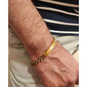 Ανδρικό βραχιόλι με ταυτότητα με ματ και λουστρέ σχέδιο, από κίτρινο επιχρυσωμένο ανοξείδωτο ατσάλι. Διαθέτει δεύτερο κλιπ στη σειρά ώστε να το αφαιρείτε όποτε θέλετε για μικρή αυξομείωση του μήκους…