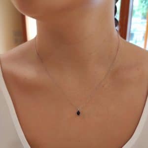 Κολιέ αλυσίδα με κρεμαστό σταγόνα με ένα μπλε ζαφείρι κοπής pear-cut δεμένο. Είναι κατασκευασμένο από λευκό χρυσό 18 καρατίων. Η πέτρα συνοδεύεται από εγγύηση γεμολόγου.