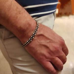 Ανδρικό σταθερό βραχιόλι μασίφ χειροπέδα με την εξωτερική πλευρά ανάγλυφη με μπίλιες από λευκό ασήμι 925° με εν μέρει μαύρη επιμετάλλωση. Φοριέται από το πλάι του καρπού και μετά το…