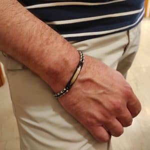 Ανδρικό βραχιόλι με μαύρη σιλικόνη διακοσμημένη με στοιχεία από λευκό, κίτρινο επιχρυσωμένο με δύο μικρές μαύρες πέτρες και μαύρο επιμεταλλωμένο ανοξείδωτο ατσάλι στο επάνω μέρος. Στο κάτω μέρος κλιπ από…
